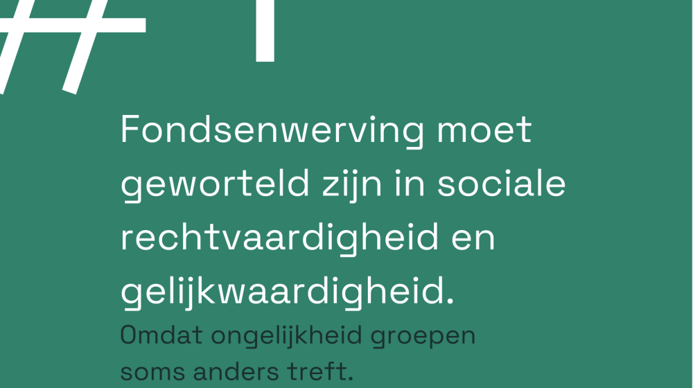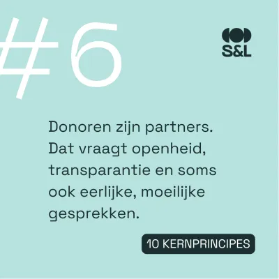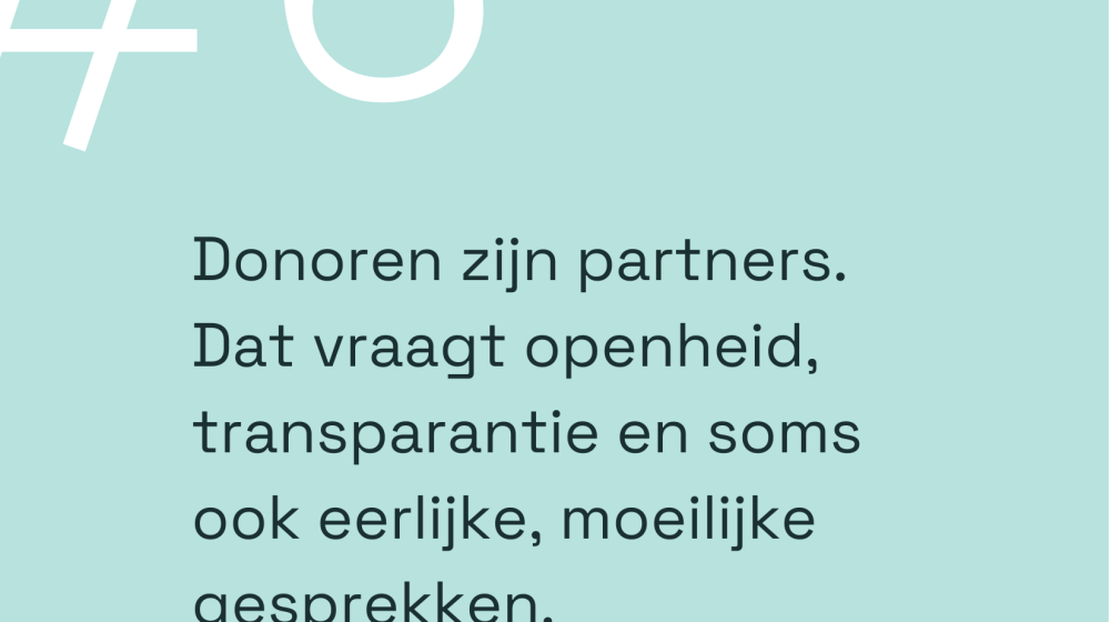 Fondsenwervers zijn genereus naar andere organisaties: deel kennis, contacten, subsidiekansen en vermeld elkaars werk publiekelijk. Co-creatie met de mensen waarvoor je werkt: geef hen een stem in beslissingen, betrek hen bij het formuleren van doelen, en laat hun noden leidend blijven. Donors zijn namelijk partners, geen geldschieters: wees transparant, ook als het moeilijk is, en voer soms een lastig gesprek. Besef dat iedereen, zowel donors als medewerkers als vrijwilligers, persoonlijk baat heeft bij een rechtvaardiger samenleving: dit is geen liefdadigheid, dit is collectief eigenbelang.